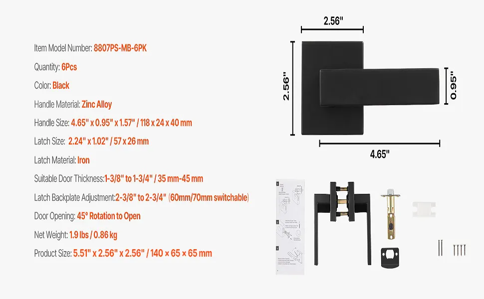 Ручка для прохідних дверей VEVOR матовий чорний квадратний дверний важіль 6 шт. ліворуч або праворуч реверсивна дверна ручка без, фото 10